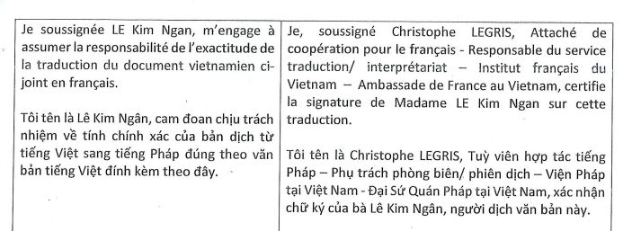 Mme Le ne prétend pas être une traductrice officielle de Cour d’Appel, donc elle ne commet aucune infraction explicite. Elle dit simplement que c’est elle qui a traduit et qu’elle l’assume. Un principe de base du droit étant que tout le monde doit assumer ses actes, cette déclaration ne signifie rien et ne l’engage à rien. Ce sont juste des mots.